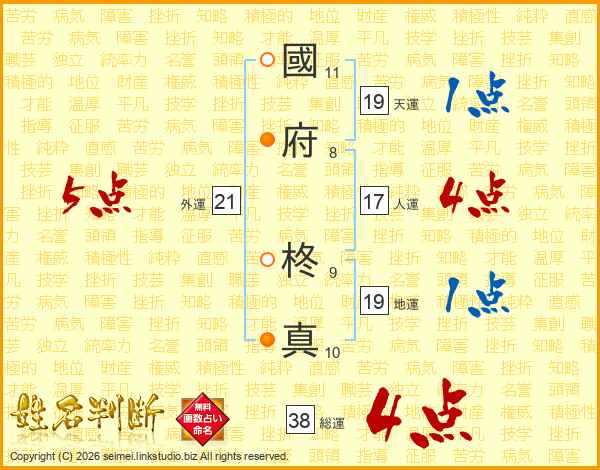 生活面を象徴する運勢です。外部から受ける影響力を表し、結婚運、家庭運や職場、環境への順応性を表します。総運から人運を引いた画数。姓や名が1文字の場合を除く。