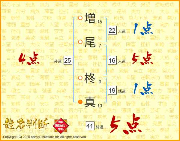 生活面を象徴する運勢です。外部から受ける影響力を表し、結婚運、家庭運や職場、環境への順応性を表します。総運から人運を引いた画数。姓や名が1文字の場合を除く。