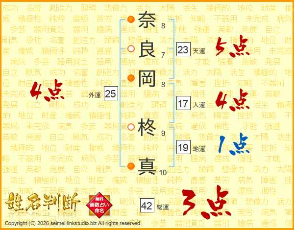 奈(8画)良(7画)岡(8画) 柊(9画)真(10画)