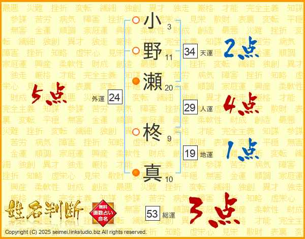 小(3画)野(11画)瀬(20画) 柊(9画)真(10画)