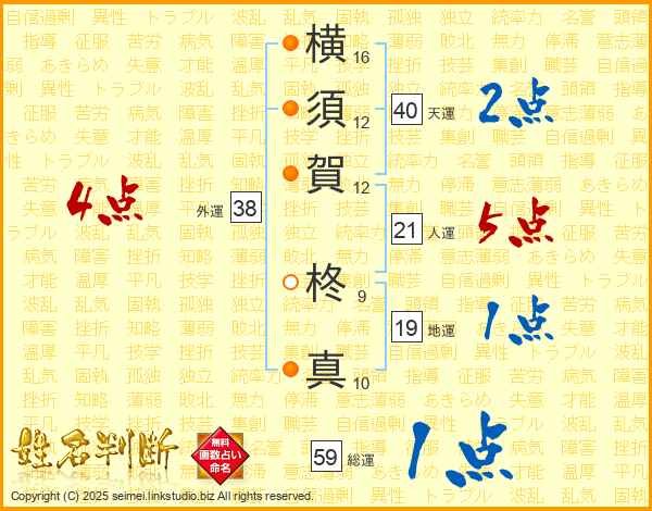 横(16画)須(12画)賀(12画) 柊(9画)真(10画)