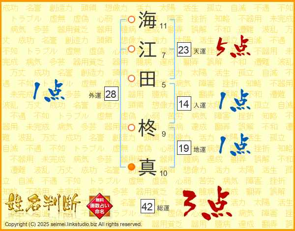 海(11画)江(7画)田(5画) 柊(9画)真(10画)
