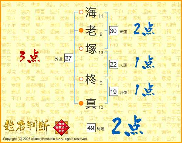 海(11画)老(6画)塚(13画) 柊(9画)真(10画)