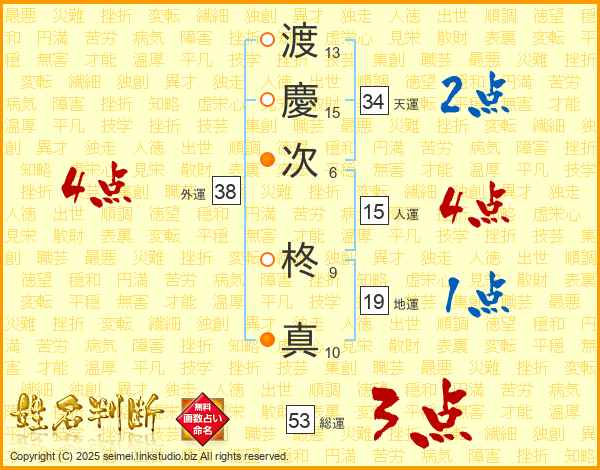 渡(13画)慶(15画)次(6画) 柊(9画)真(10画)