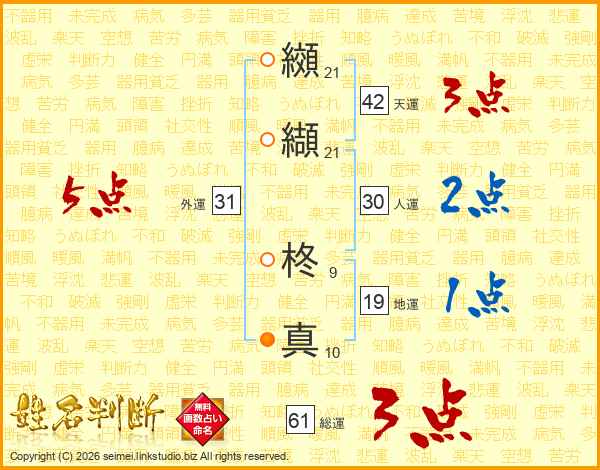 生活面を象徴する運勢です。外部から受ける影響力を表し、結婚運、家庭運や職場、環境への順応性を表します。総運から人運を引いた画数。姓や名が1文字の場合を除く。