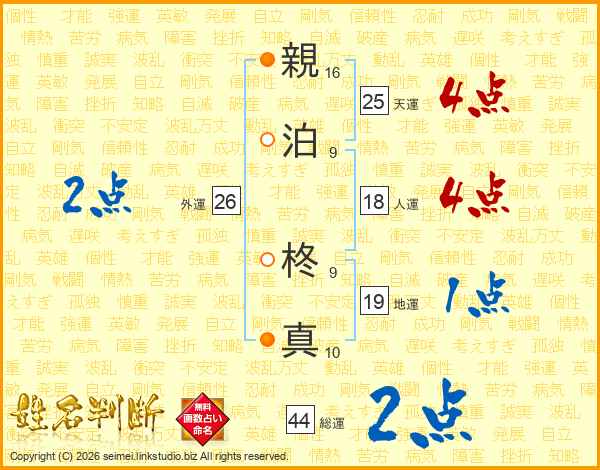 親(16画)泊(9画) 柊(9画)真(10画)