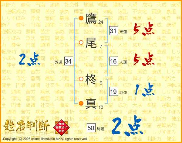 鷹(24画)尾(7画) 柊(9画)真(10画)