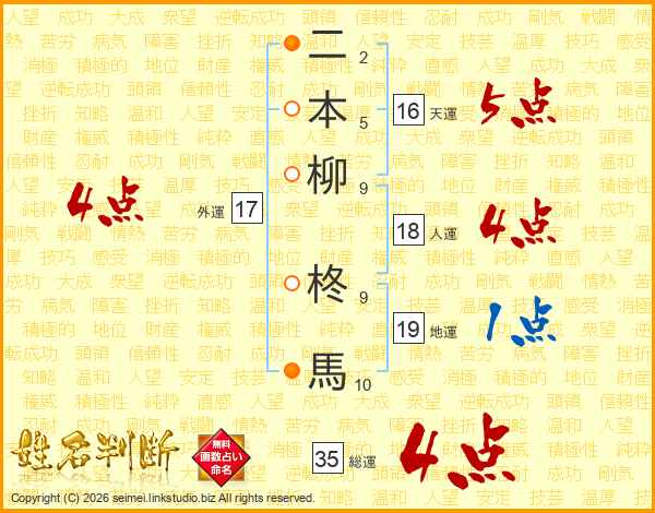 二(2画)本(5画)柳(9画) 柊(9画)馬(10画)