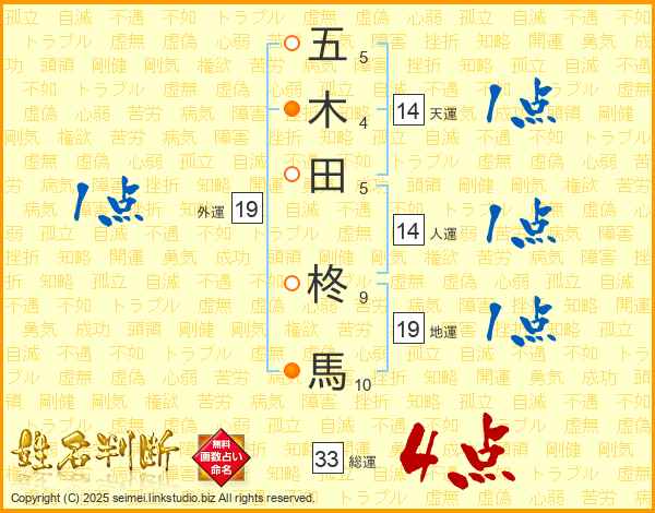 五(5画)木(4画)田(5画) 柊(9画)馬(10画)