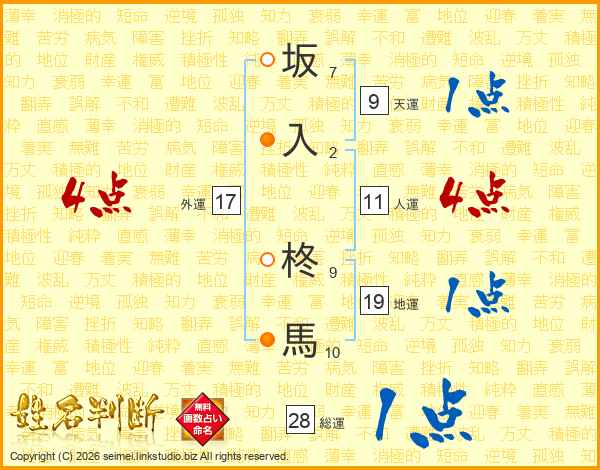 坂(7画)入(2画) 柊(9画)馬(10画)