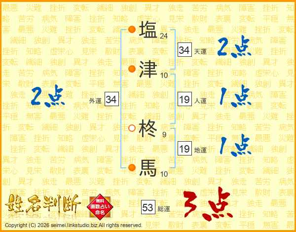塩(24画)津(10画) 柊(9画)馬(10画)