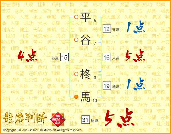 平(5画)谷(7画) 柊(9画)馬(10画)