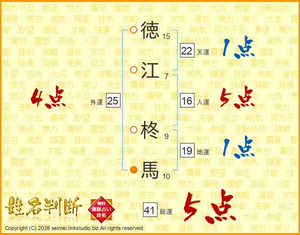 徳(15画)江(7画) 柊(9画)馬(10画)