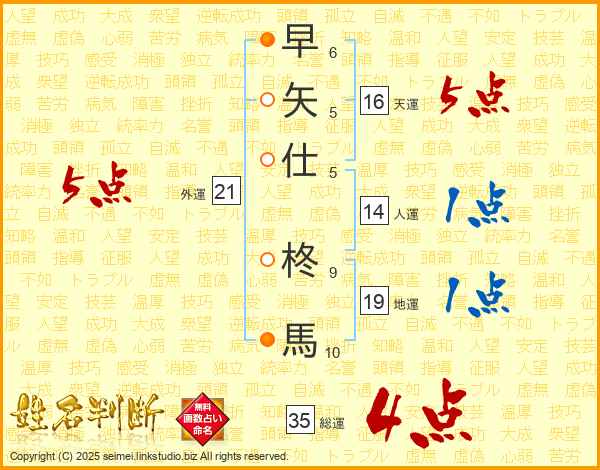 早(6画)矢(5画)仕(5画) 柊(9画)馬(10画)