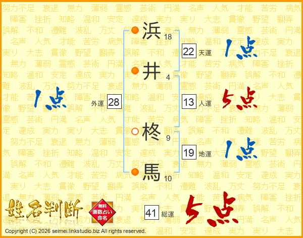 浜(18画)井(4画) 柊(9画)馬(10画)