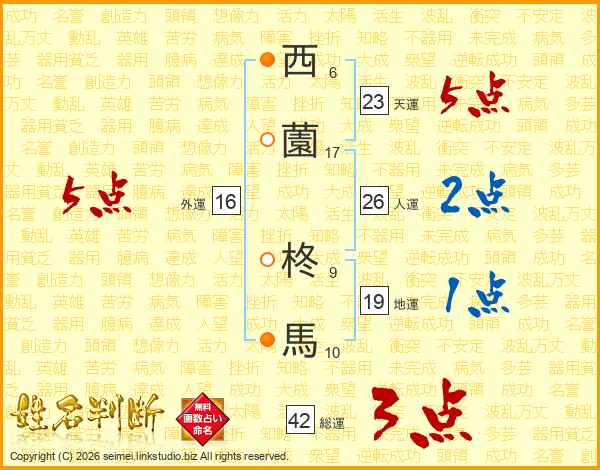 西(6画)薗(17画) 柊(9画)馬(10画)