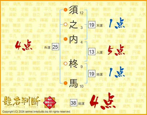 須(12画)之(3画)内(4画) 柊(9画)馬(10画)