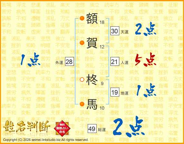 額(18画)賀(12画) 柊(9画)馬(10画)