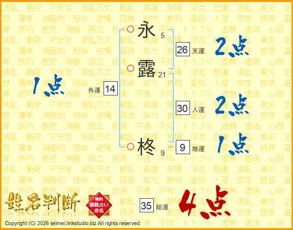 生活面を象徴する運勢です。外部から受ける影響力を表し、結婚運、家庭運や職場、環境への順応性を表します。総運から人運を引いた画数。姓や名が1文字の場合を除く。