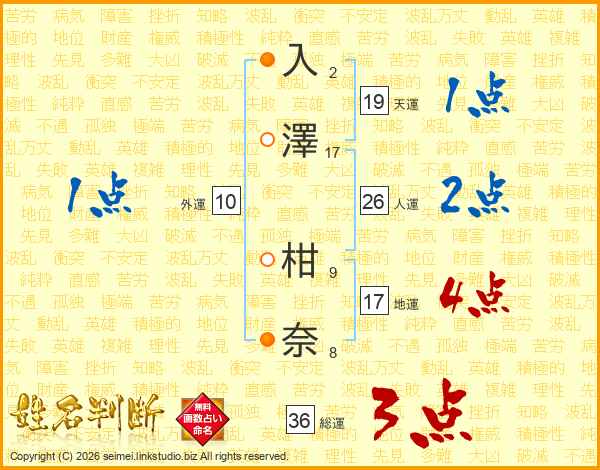入(2画)澤(17画) 柑(9画)奈(8画)