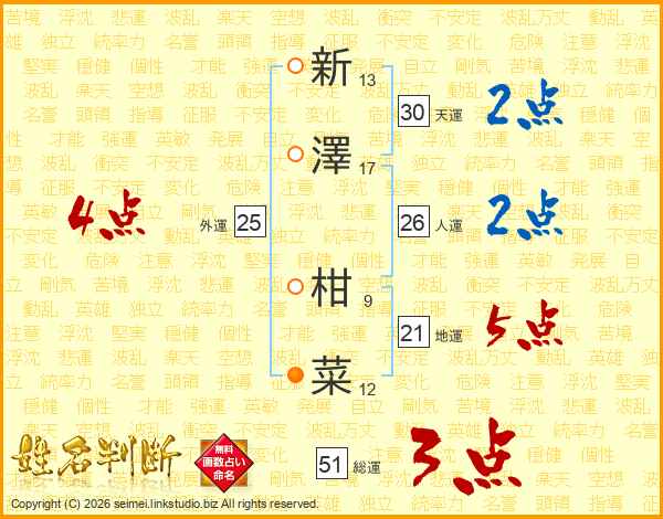 新(13画)澤(17画) 柑(9画)菜(12画)