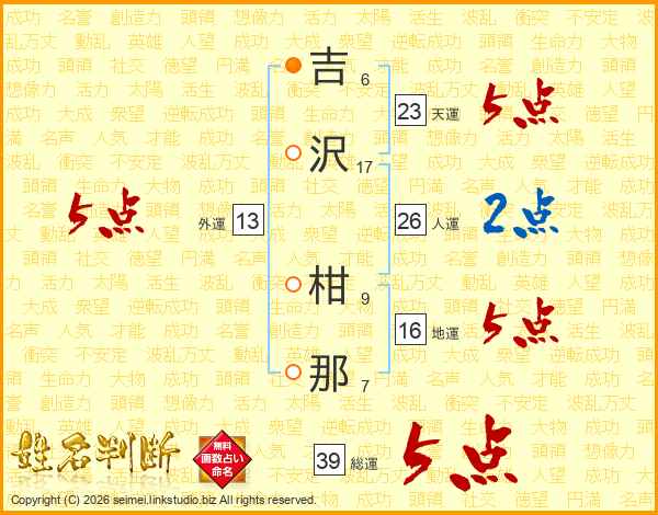 吉沢柑那さんの天運は23画の5点!