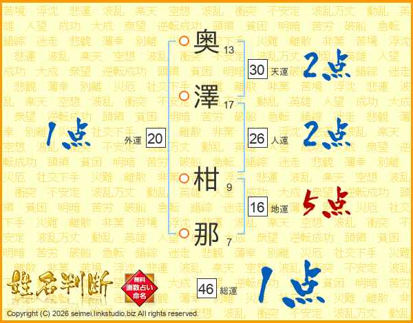 奥(13画)澤(17画) 柑(9画)那(7画)