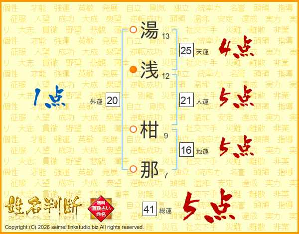 湯浅柑那さんの総運は41画の5点!