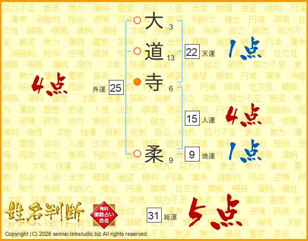 生活面を象徴する運勢です。外部から受ける影響力を表し、結婚運、家庭運や職場、環境への順応性を表します。総運から人運を引いた画数。姓や名が1文字の場合を除く。