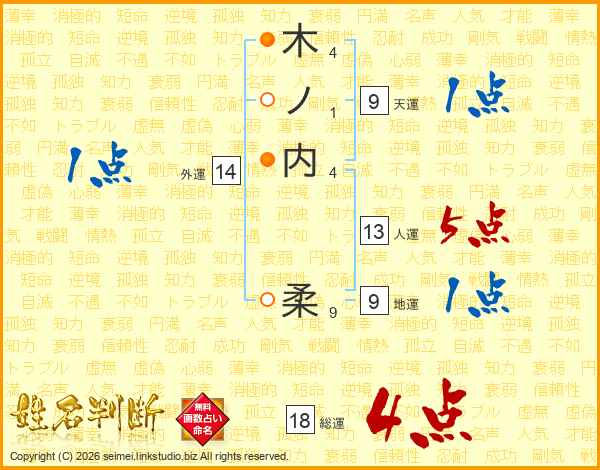 木(4画)ノ(1画)内(4画) 柔(9画)
