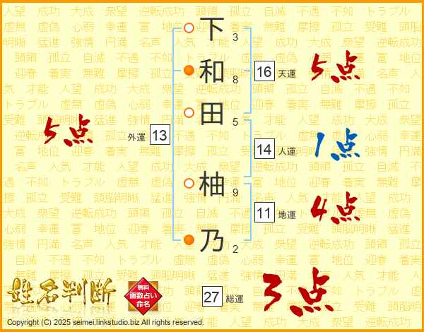 下(3画)和(8画)田(5画) 柚(9画)乃(2画)