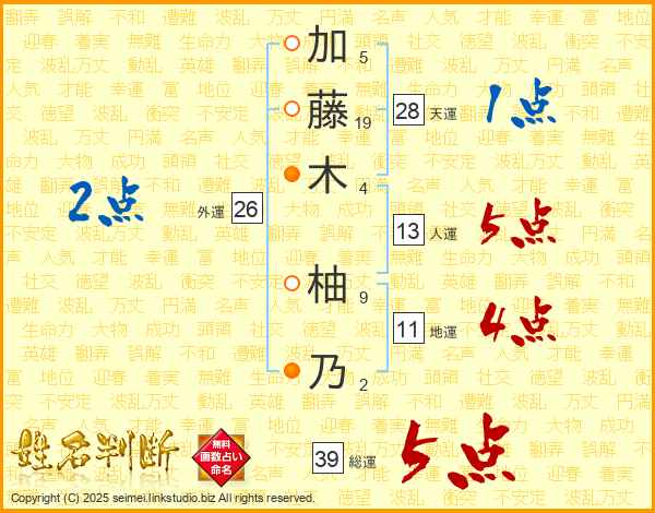 加(5画)藤(19画)木(4画) 柚(9画)乃(2画)