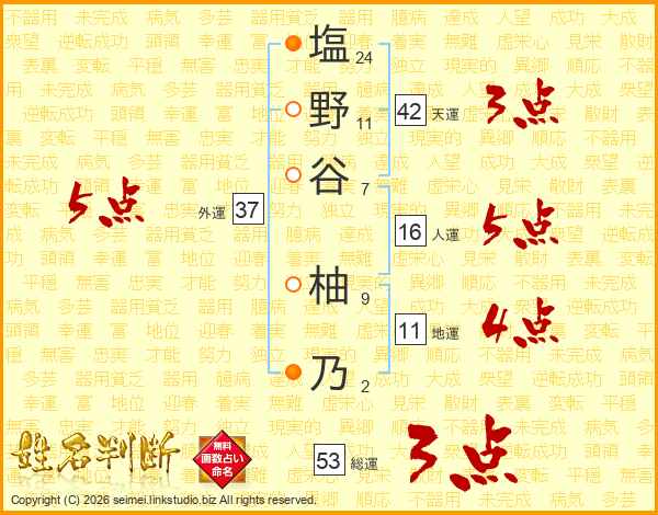 塩(24画)野(11画)谷(7画) 柚(9画)乃(2画)