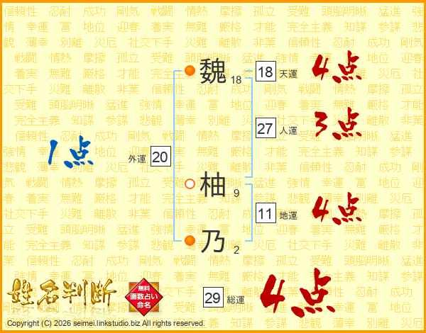 魏柚乃さんの総運は29画の4点!