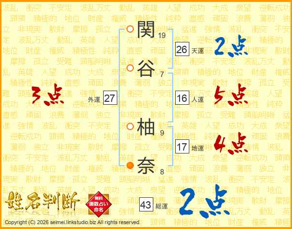 関(19画)谷(7画) 柚(9画)奈(8画)