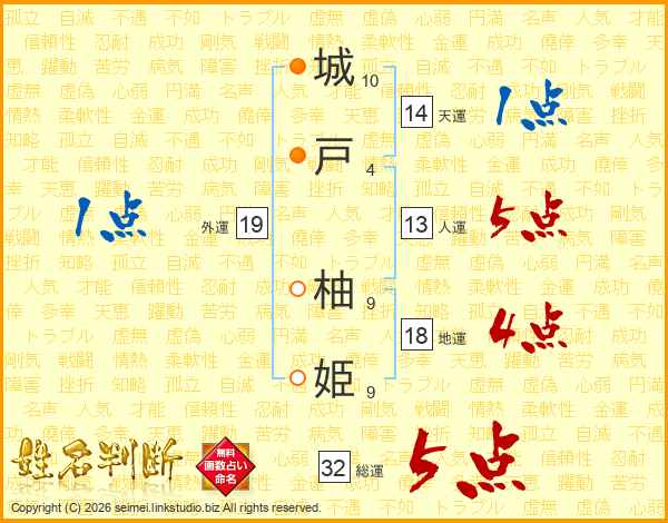 城(10画)戸(4画) 柚(9画)姫(9画)