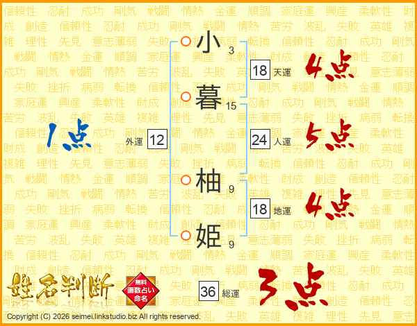小(3画)暮(15画) 柚(9画)姫(9画)