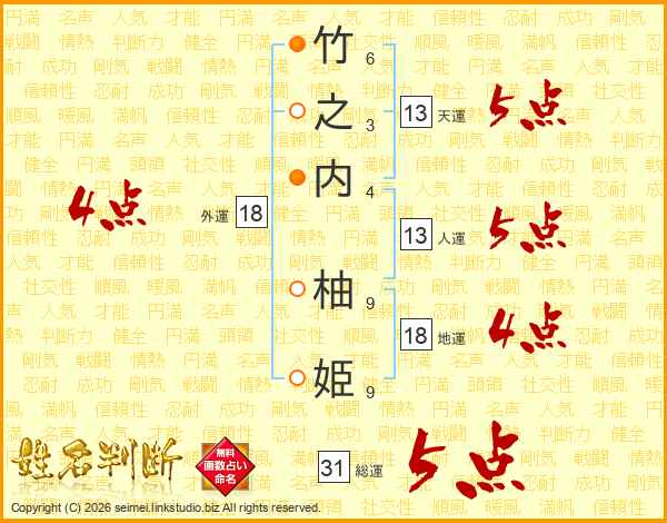 竹(6画)之(3画)内(4画) 柚(9画)姫(9画)