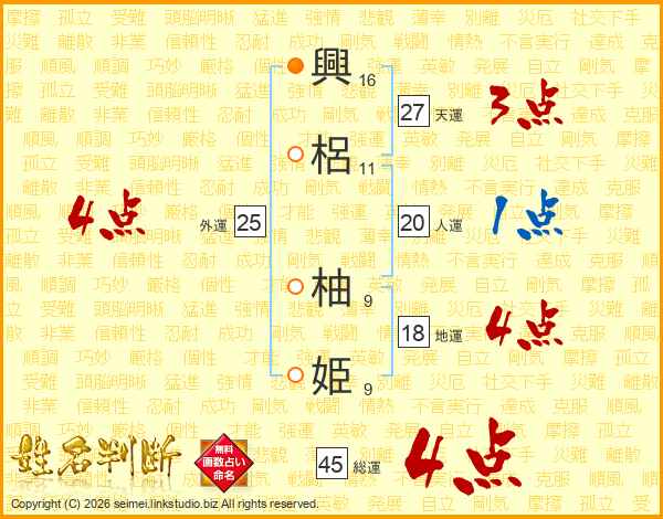 興(16画)梠(11画) 柚(9画)姫(9画)