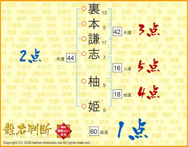 裏(13画)本(5画)謙(17画)志(7画) 柚(9画)姫(9画)