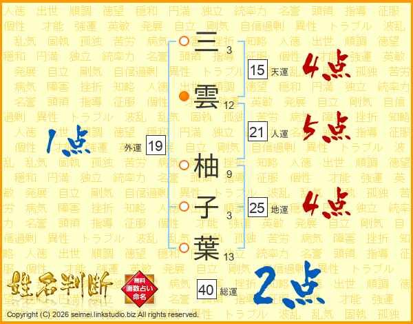 三(3画)雲(12画) 柚(9画)子(3画)葉(13画)