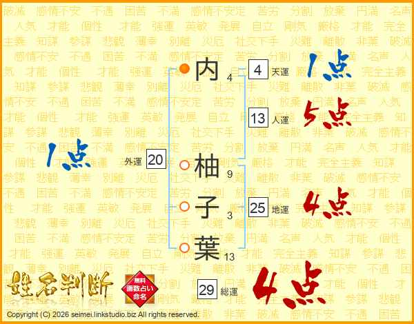内(4画) 柚(9画)子(3画)葉(13画)