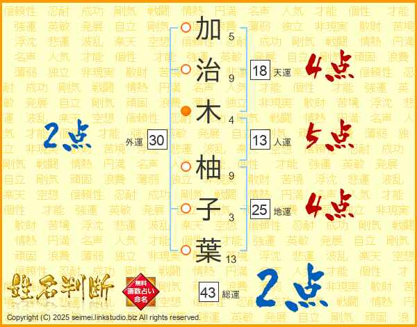 加(5画)治(9画)木(4画) 柚(9画)子(3画)葉(13画)