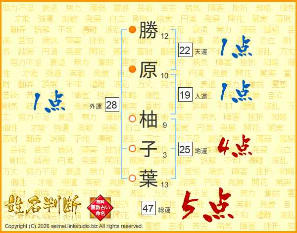勝(12画)原(10画) 柚(9画)子(3画)葉(13画)