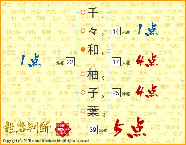 千(3画)々(3画)和(8画) 柚(9画)子(3画)葉(13画)