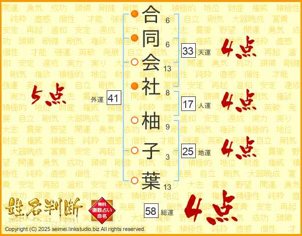 合(6画)同(6画)会(13画)社(8画) 柚(9画)子(3画)葉(13画)