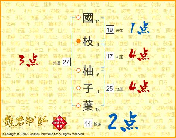 國(11画)枝(8画) 柚(9画)子(3画)葉(13画)