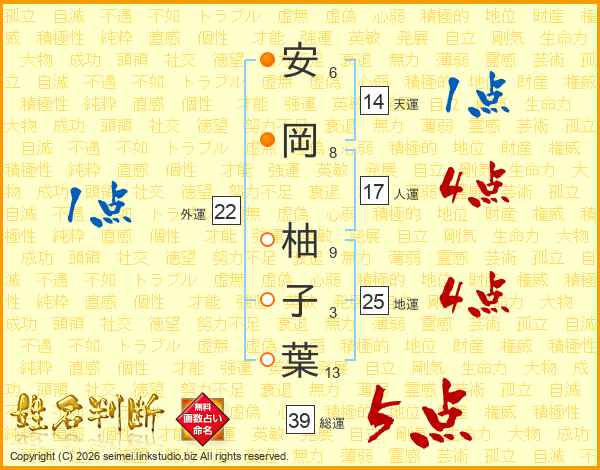 安(6画)岡(8画) 柚(9画)子(3画)葉(13画)