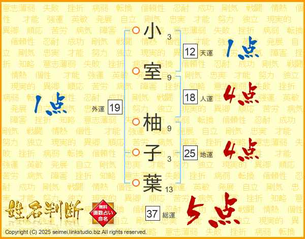 小(3画)室(9画) 柚(9画)子(3画)葉(13画)