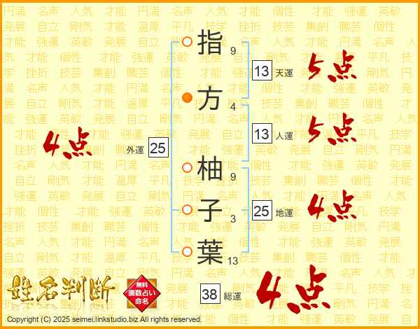 指(9画)方(4画) 柚(9画)子(3画)葉(13画)